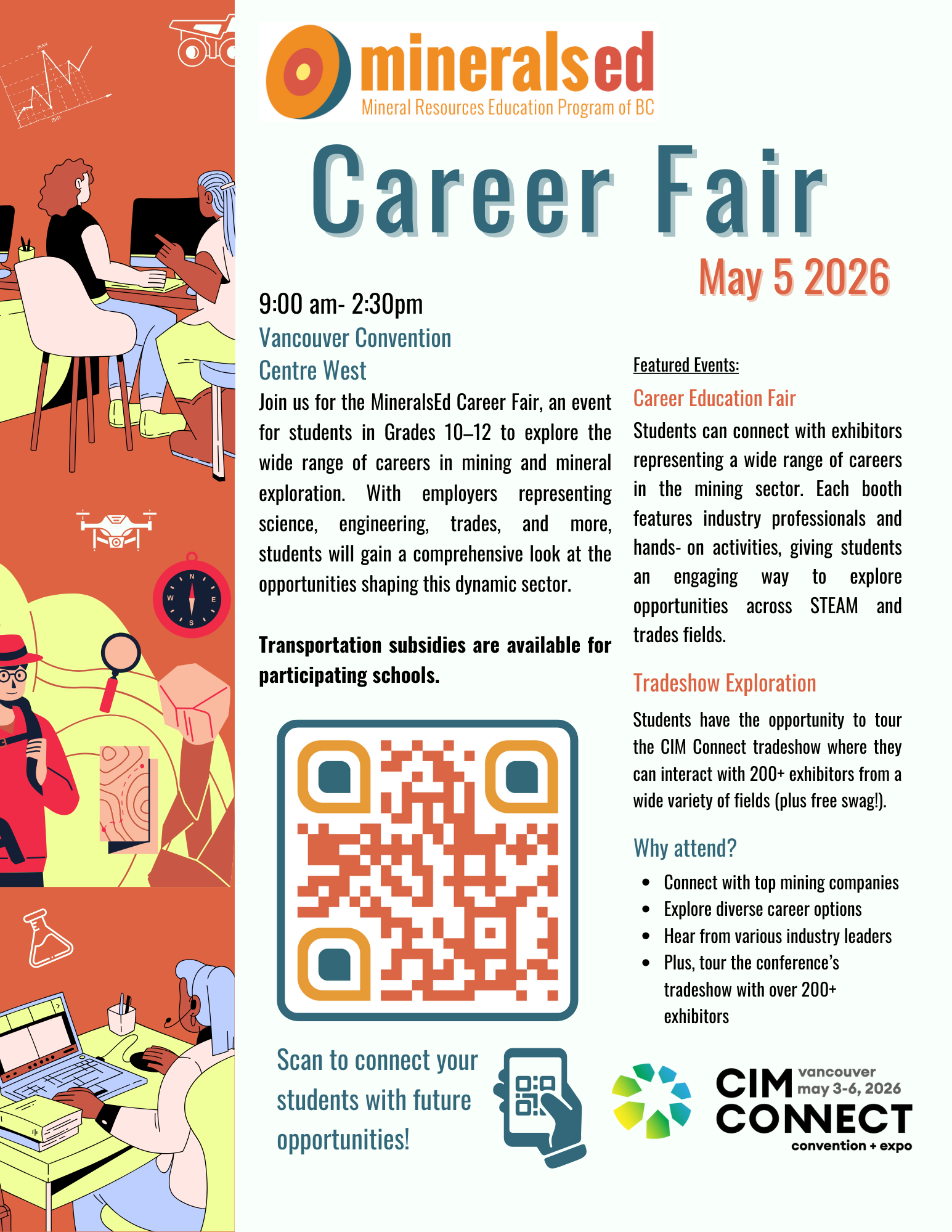 Join us at CIM Connect for the MineralsEd Career Fair, specifically tailored for students in grades 10-12! This event offers an incredible opportunity for students to engage with employers and discover a diverse range of career options, spanning from science and engineering to trades. Moreover, our career fair will have BCIT and EducationPlannerBC for students to learn how to pursue various careers. Don't miss out on this fantastic chance to gain insights and explore the dynamic world of the mining sector. Seize the opportunity to shape your future—be a part of CIM Connect!