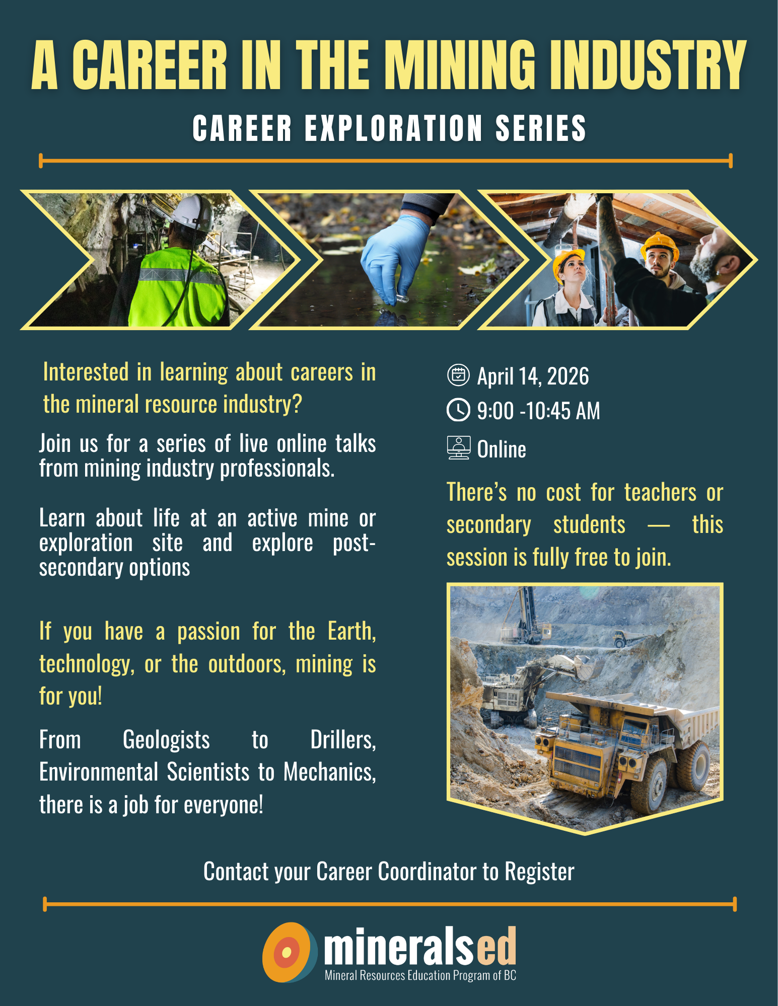 MineralsEd invites grade 10-12 students from across BC to join us virtually on Tuesday, April 14, 2026, for a series of career talks from professionals in the minerals industry to explore the breadth of careers available within the mining and mineral exploration industry.